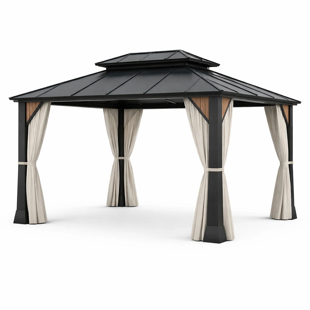 Gazebo de aluminio con techo de metal azul y cortinas de poliéster