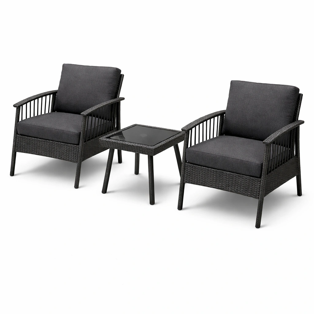 El conjunto incluye dos sillones de ratán sintético con cojines de poliéster y una mesa con tablero de vidrio templado de 5 mm de grosor.