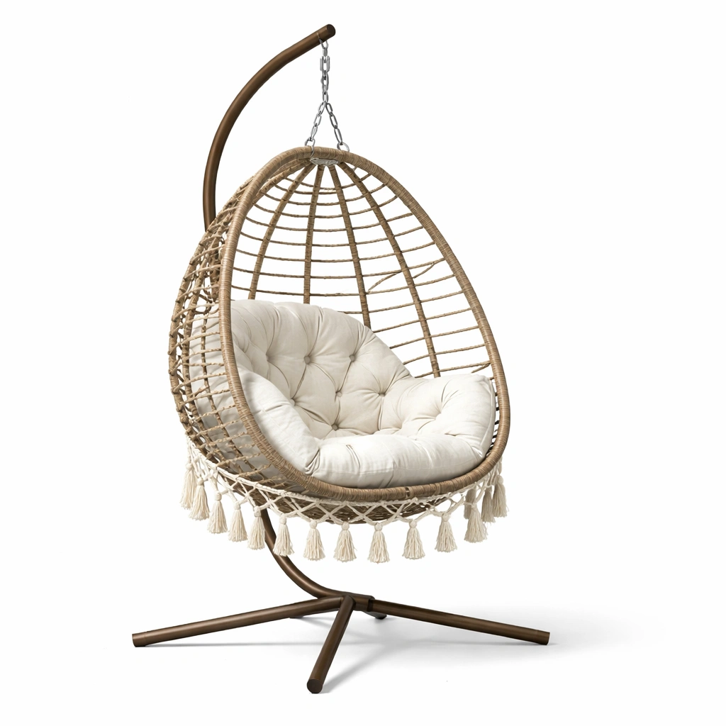Exterior de ratán sintético en forma de huevo con diseño colgante.